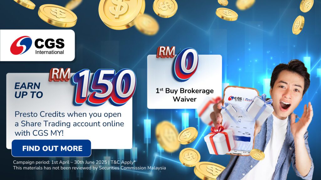 With real-time market data, advanced trading tools, and award-winning research insights, CGS MY empowers you to trade with confidence. Now, when you open, fund & trade, you can earn up to RM150 Presto Credits to redeem for over 20,000 products & services! This limited-time offer runs from 1 April to 30 June 2025—don’t miss out!