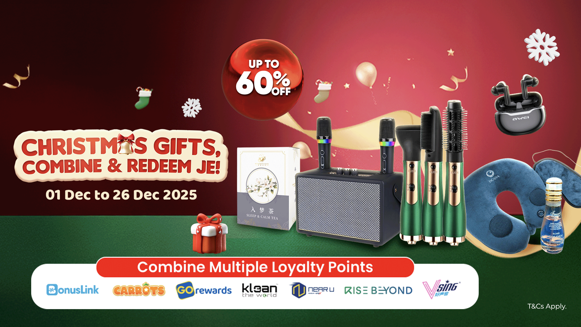 From 1 December to 26 December 2025, redeem your favourite holiday gifts using multiple loyalty points combined like BonusLink, GOrewards, Carrots, Vsing, and more!