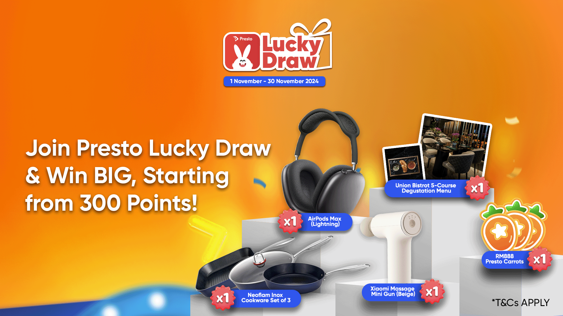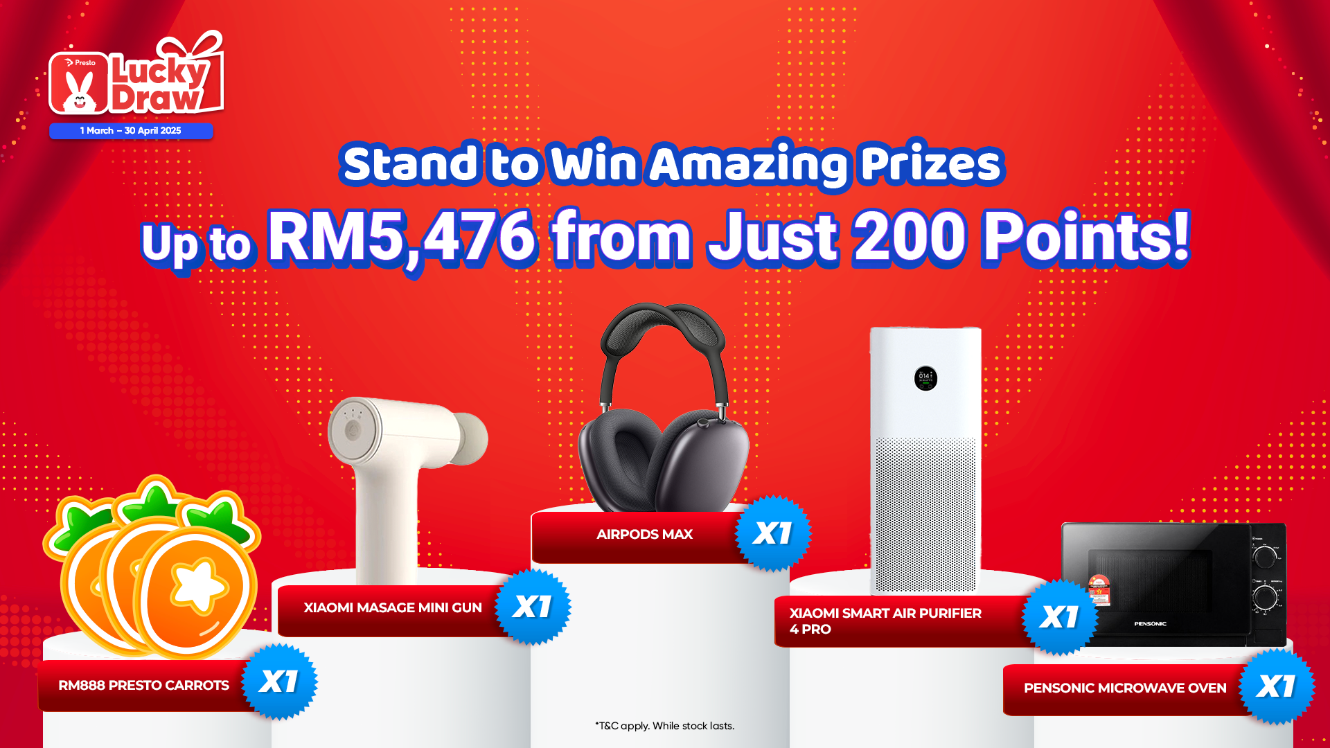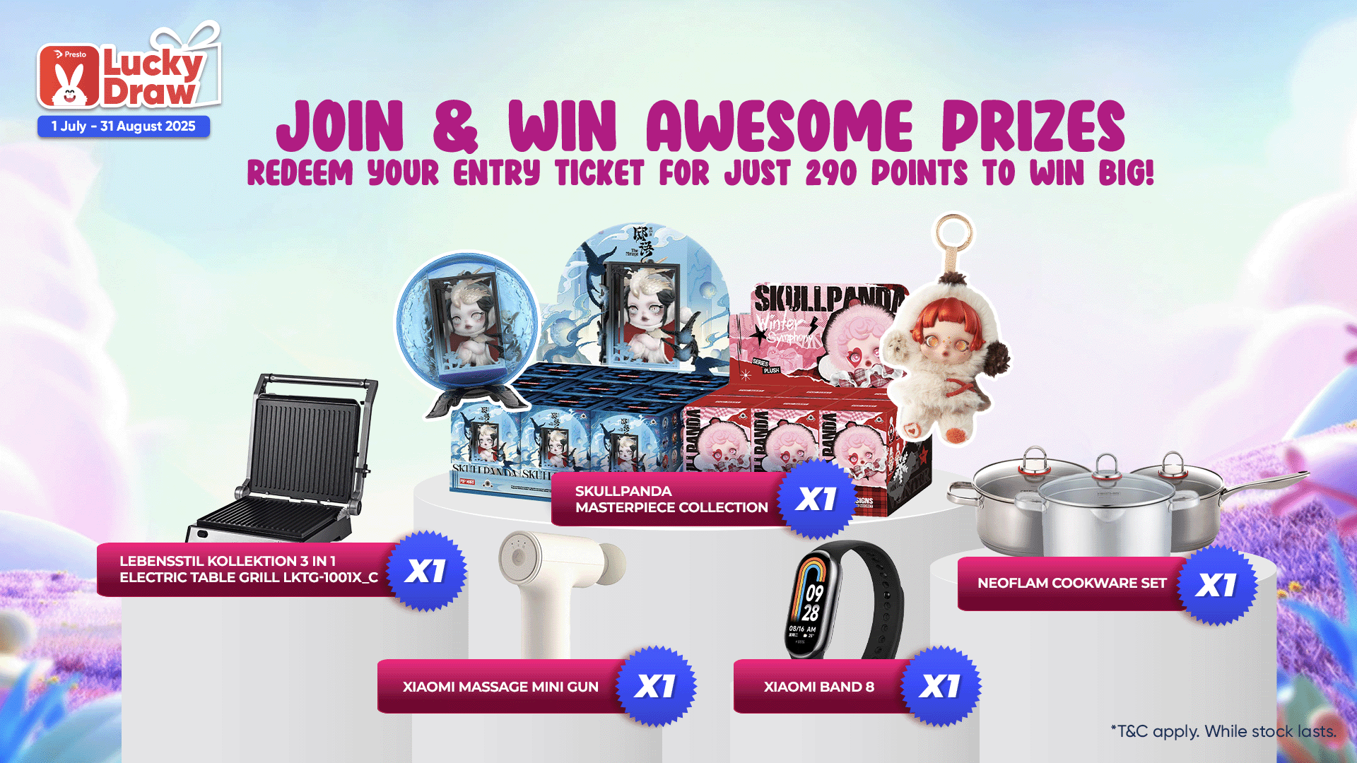 Choose the prizes you want to win and redeem their e-vouchers using your points! Each e-voucher redemption equals one entry to the Presto Lucky Draw.