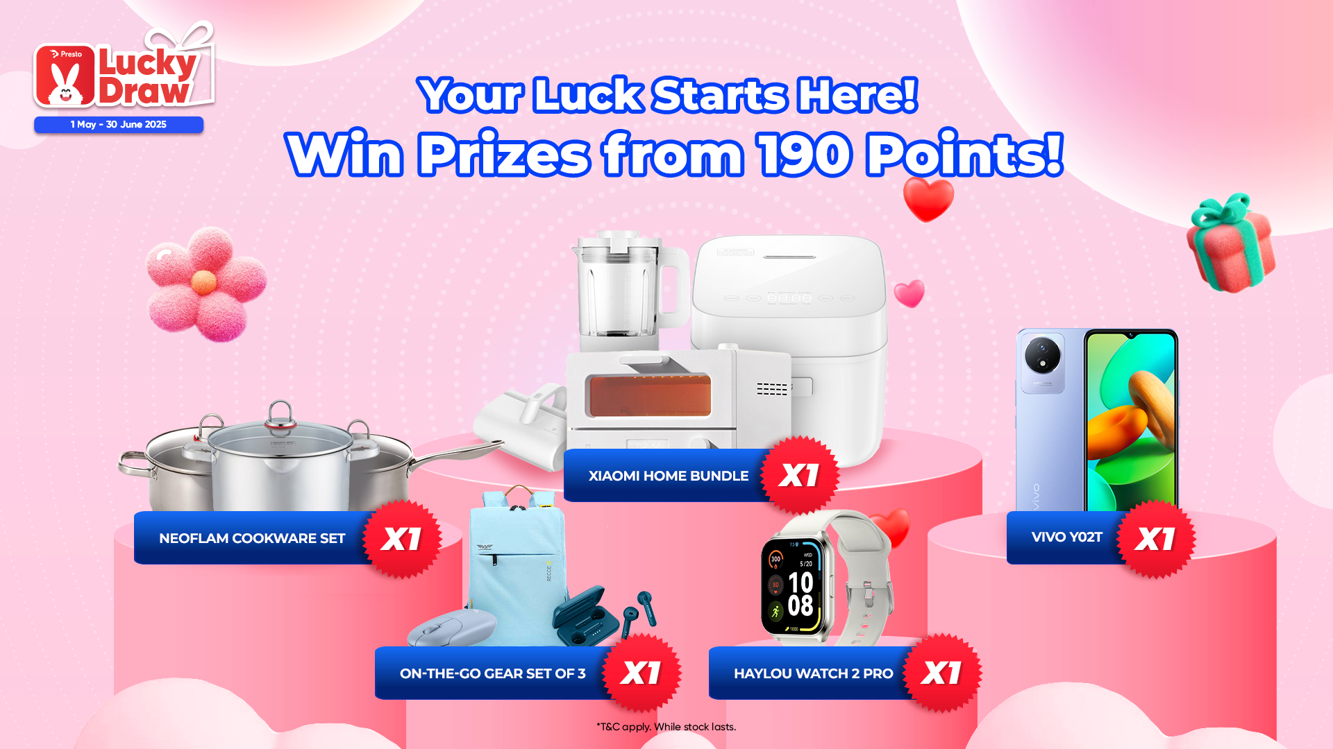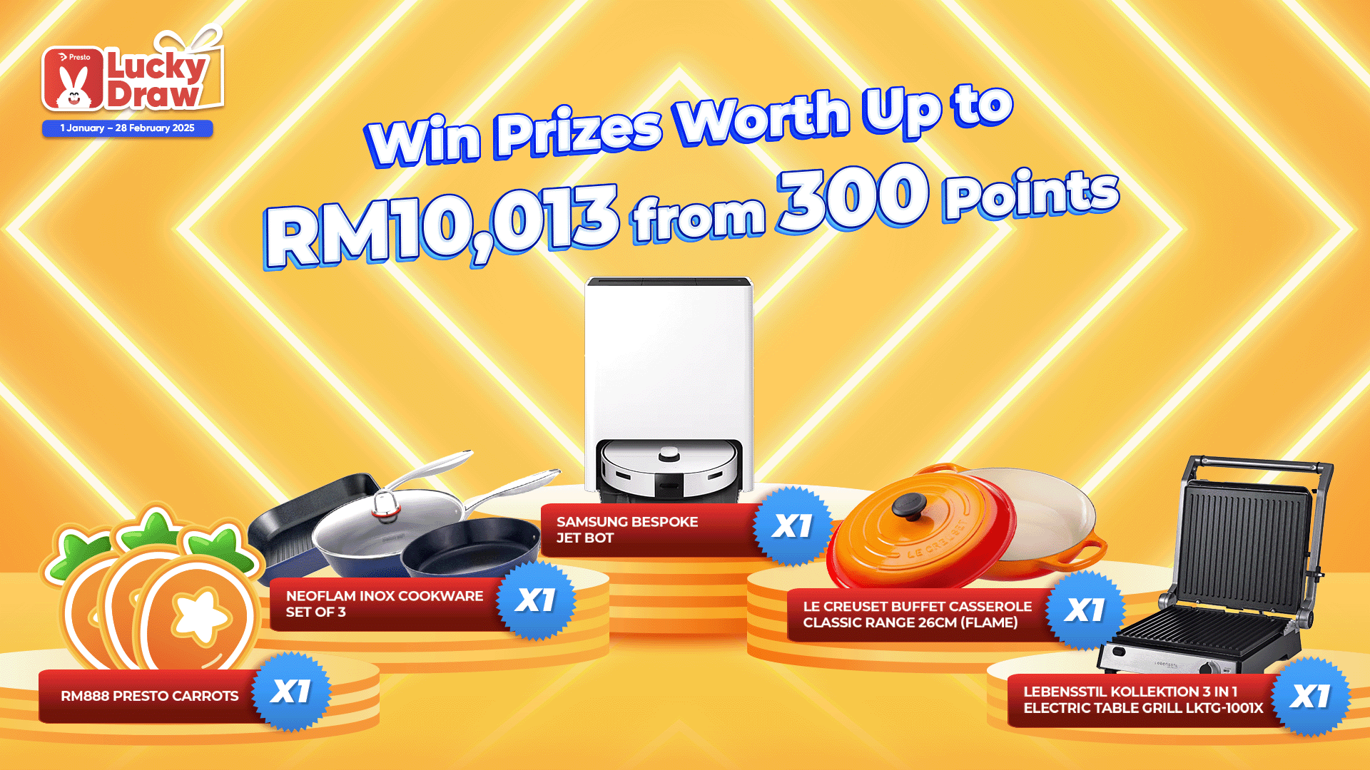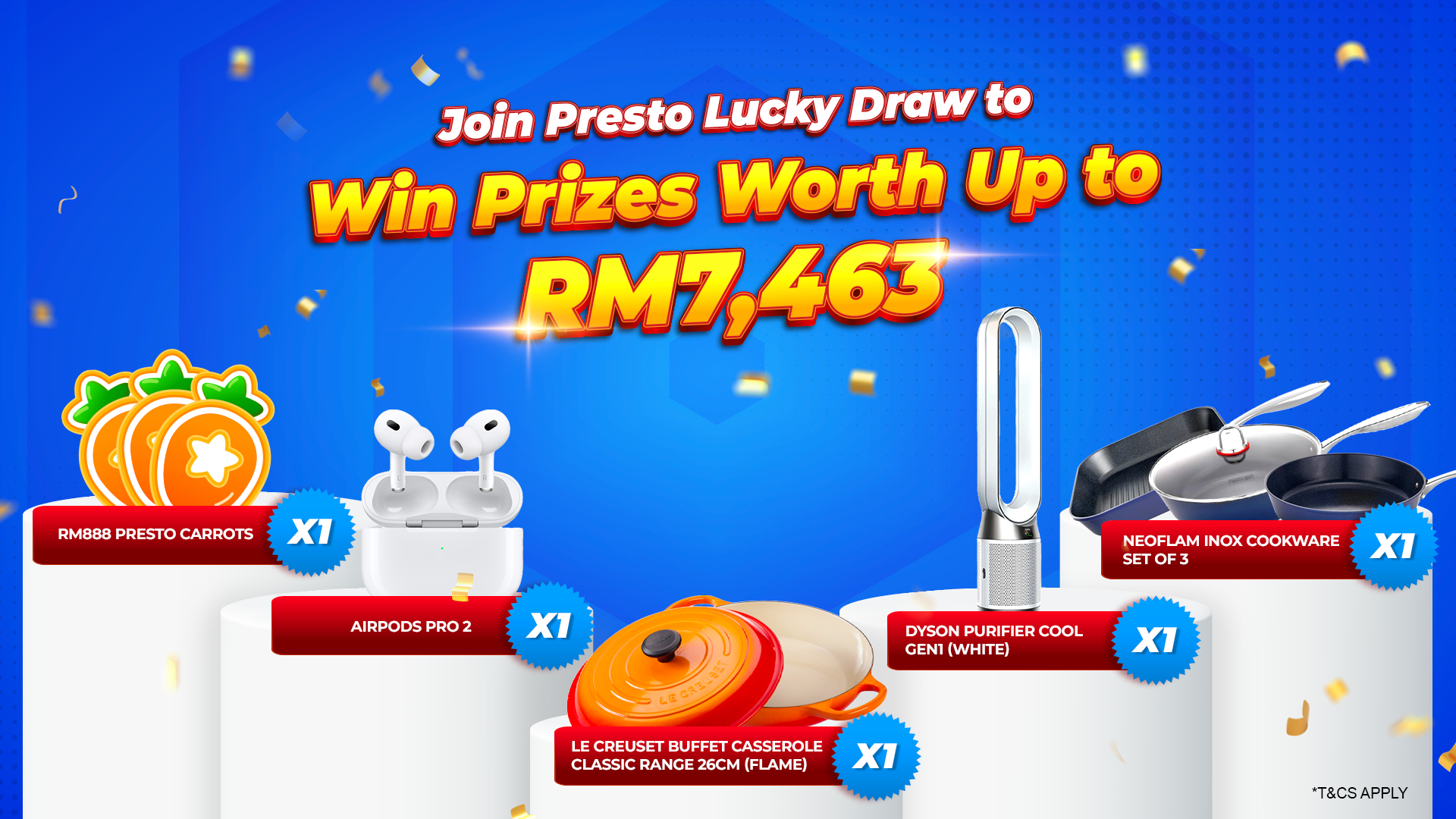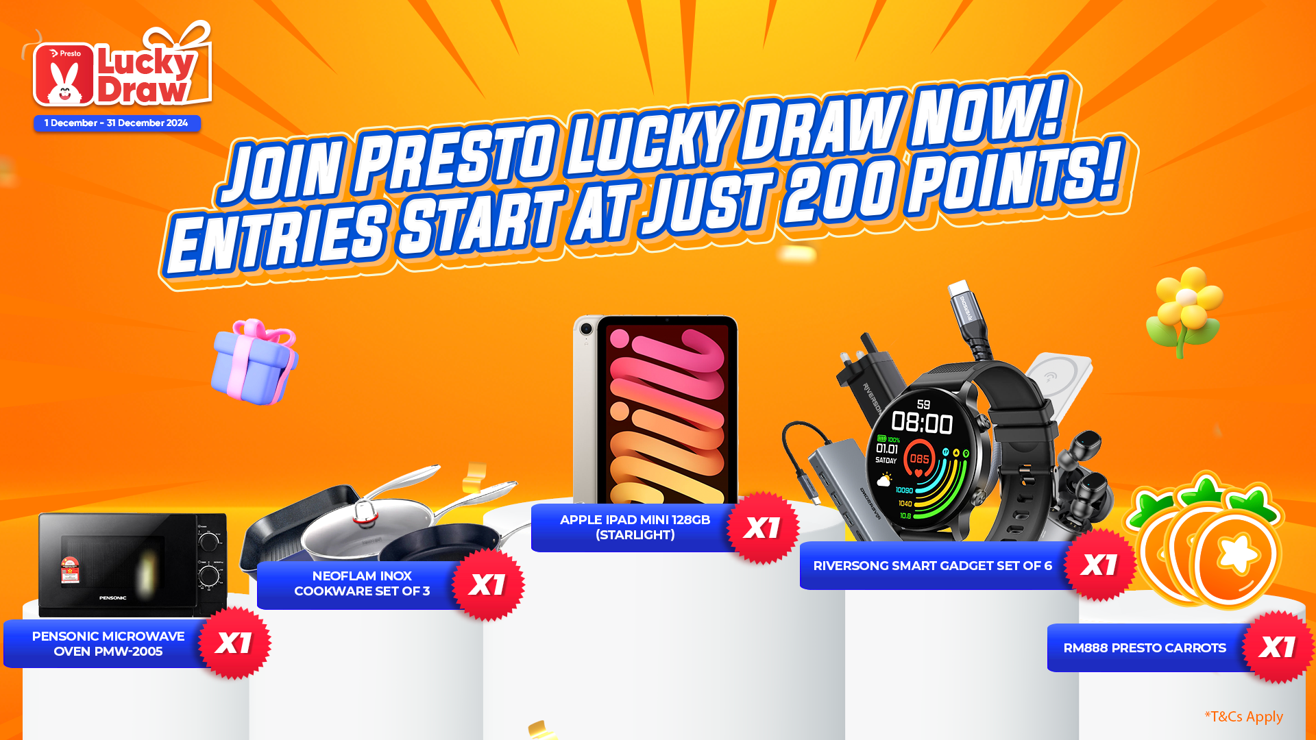 Choose the prizes you want to win and redeem their e-vouchers using your points! Each e-voucher redemption equals one entry to the Presto Lucky Draw.